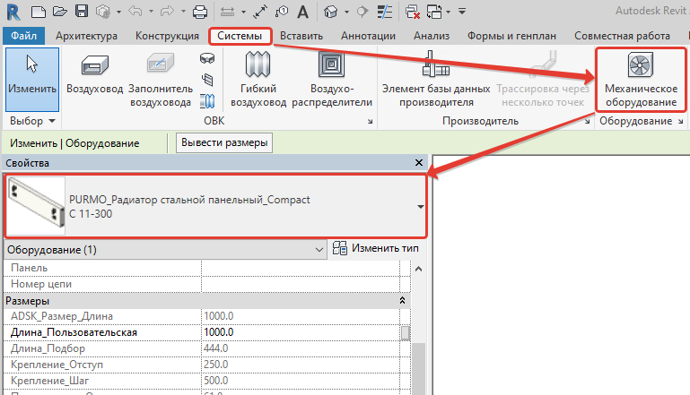 Для размещения моделей необходимо перейти на любой из видов, далее на панели управления перейти во вкладку «Системы», после чего кликнуть по плитке «Механическое оборудование», и в панели свойств выбрать нужную модель и разместить её так, как необходимо.