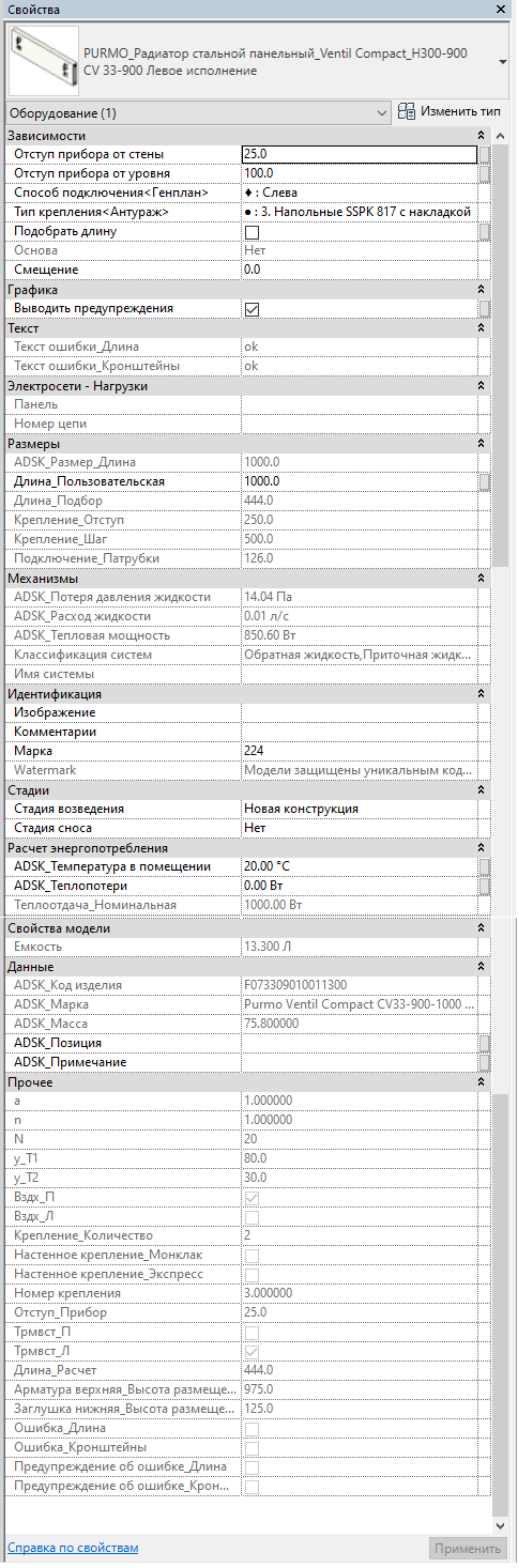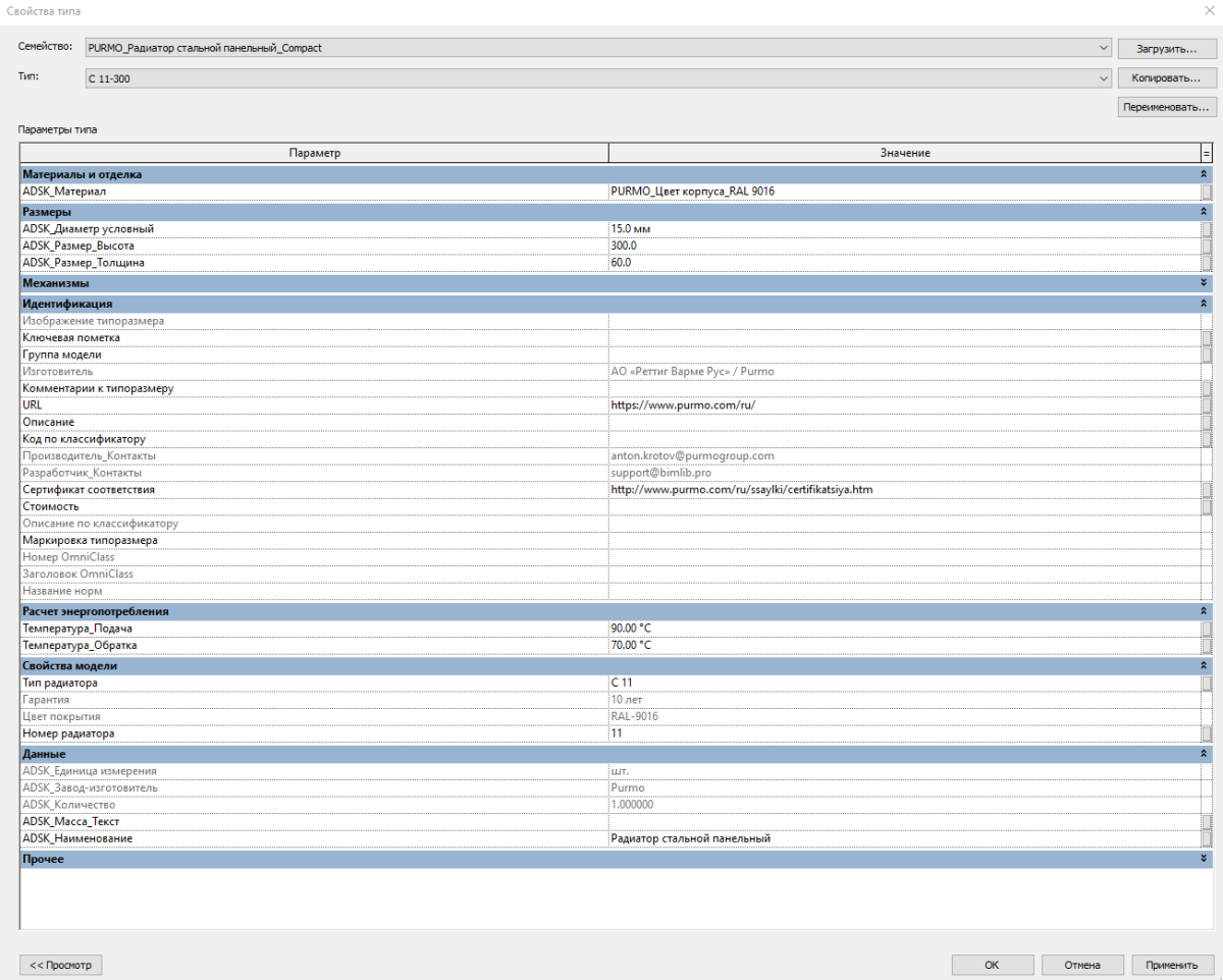 Во все семейства внесены технические характеристики, а также справочная информация и url-ссылки на документы, сайт и данные о производителе продукции и разработчике модели. Также есть ряд параметров типа, включающих в себя параметры рабочей температуры, габаритов установки, размера соединителя для подключения к системе теплоснабжения, пользовательские параметры – тип прибора, паспортные данные от завода-изготовителя, метки идентификации и прочее.
