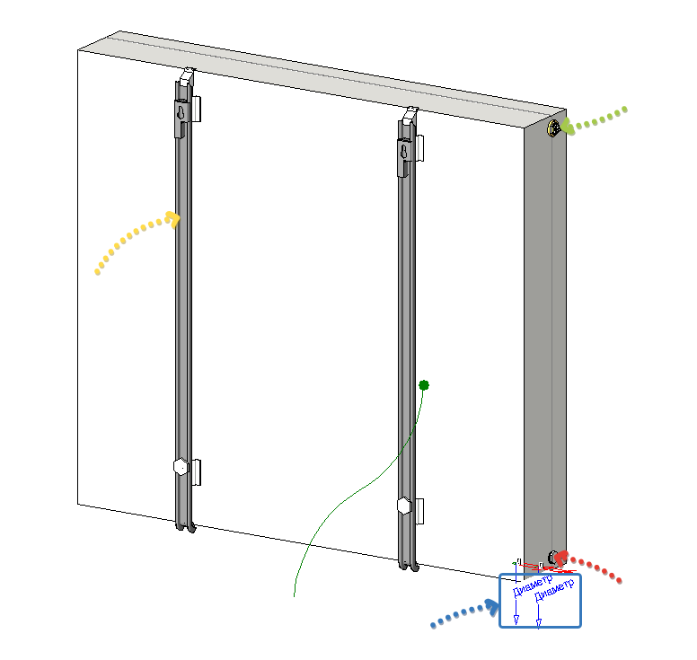 Все модели радиаторов имеют в структуре семейства крепления (жёлтая метка), воздухоотводчик (зелёная метка), заглушку (красная метка) и соединительные элементы (синяя метка) с параметрами и размерами коннекторов для приточной и обратной жидкостей. Выбор креплений реализован через выпадающие списки. Названия сторон подключения указаны так, что сторона всегда указывает на положение патрубка подающей линии. Правая и левая сторона определяются при взгляде на переднюю часть прибора.