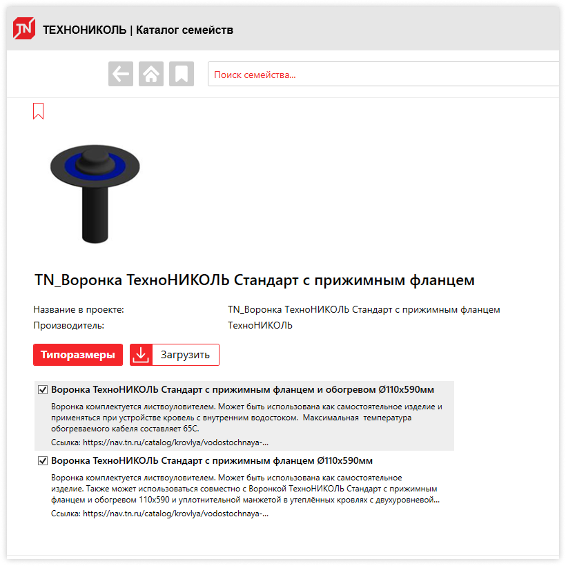При загрузке модели в проект можно настроить желаемые типоразмеры, по каждому из которых отображается описание элемента, а также ссылка на сайт с детальной информацией об элементе.