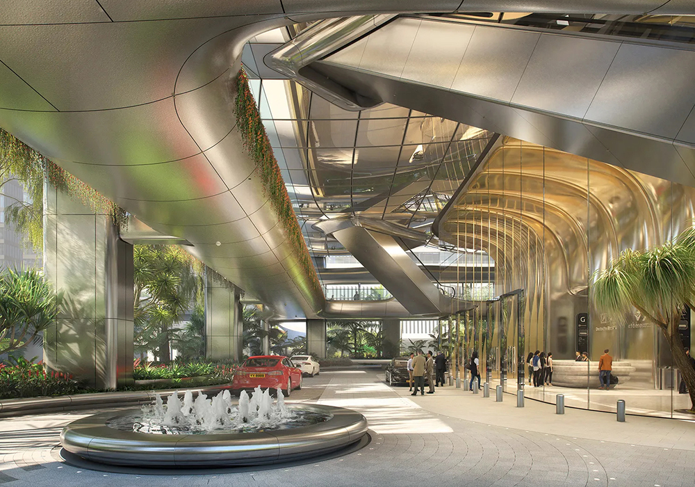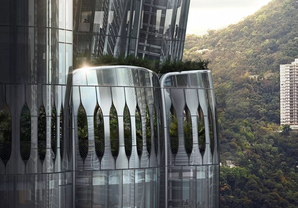 Стеклянный фасад спроектировала лондонская студия Захи Хадид. Архитекторы создали контраст с другими соседними зданиями. Например, с башней Pei Банка Китая, штаб-квартирой HSBC в здании Foster и Липпо-центром.