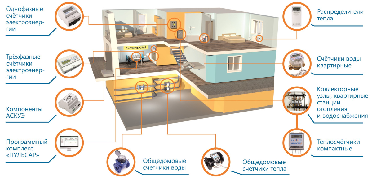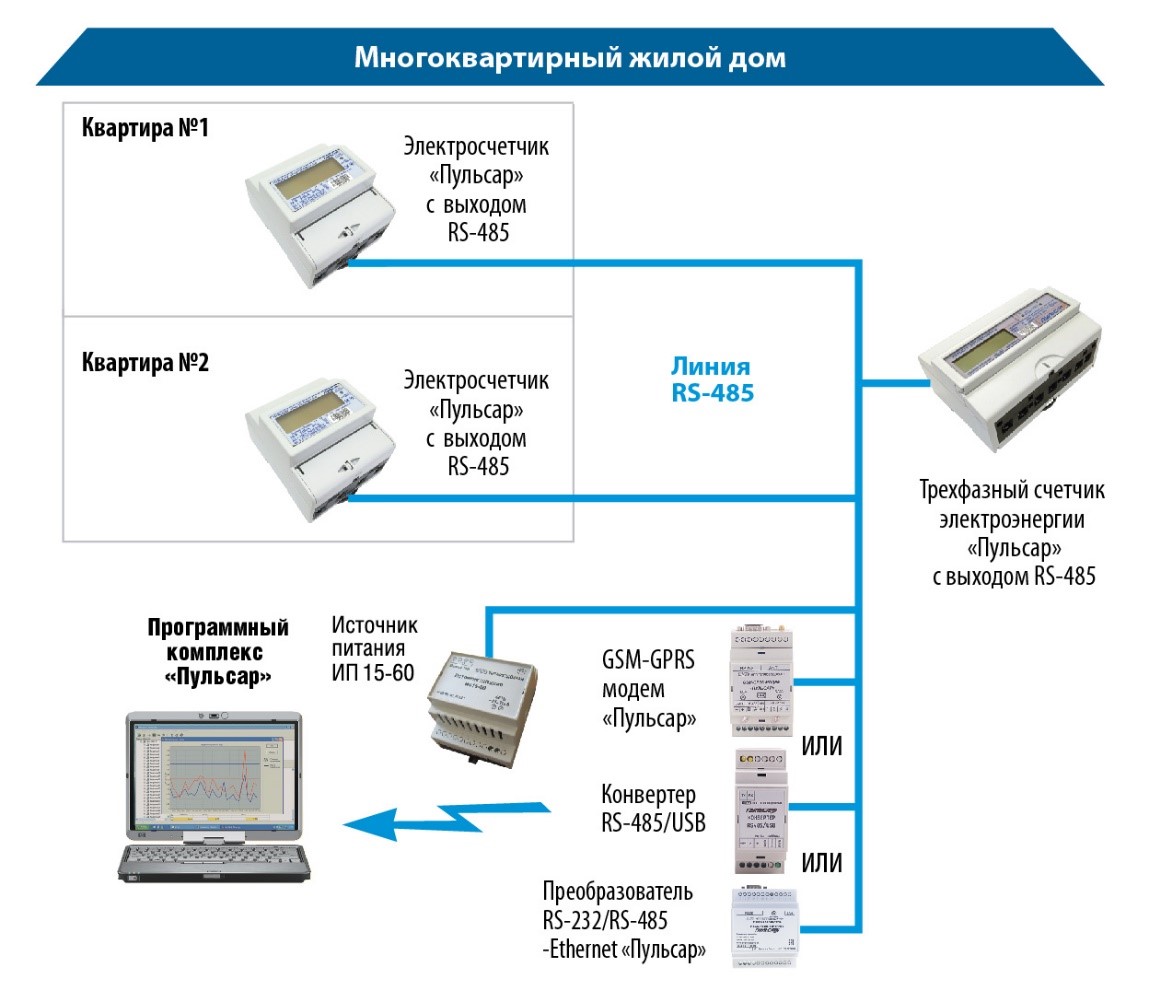 Каждый потребитель (отдельная квартира) устанавливает электросчётчик торговой марки «Пульсар» с цифровым выходом RS-485. Это бытовые однофазные счётчики, которые сочетают высокую функциональность, надёжность, удобство в использовании. Многоквартирный дом комплектуется трёхфазным общедомовым электросчётчиком. Квартирные и общедомовой приборы учёта подключаются к единой линии RS-485.