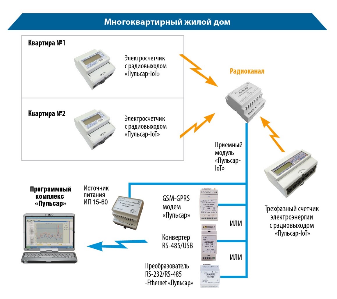 Для решения задач устанавливаются квартирные и общедомовой электросчётчики, оснащённые радиовыходом «Пульсар-IoT». Для сбора данных с приборов учёта используется специальный радиомодуль. Оптимальное место для его монтажа — межэтажное пространство. Это устройство оснащено цифровым выходом RS-485 и подключено к соответствующей шине. Далее передача данных на диспетчерский пункт аналогична вышеуказанной схеме: либо через преобразователь интерфейсов RS-232/RS-485 — Ethernet, либо RS-485/USB-конвертер, либо GSM-GPRS модем торговой марки «Пульсар».