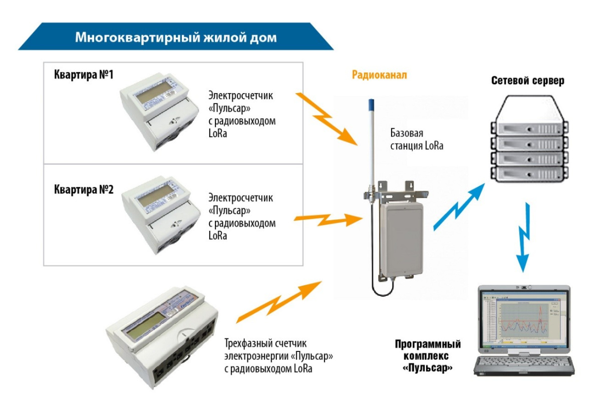Квартирные и общедомовой электросчётчики комплектуются радиовыходом LoRa. Сбор данных осуществляется базовой станцией LoRa по радиоканалу. Далее информация поступает на сетевой сервер, а оттуда передаётся на программный комплекс «Пульсар». Эта схема организации учёта вообще не предусматривает прокладки кабелей, все данные передаются исключительно по беспроводным каналам.