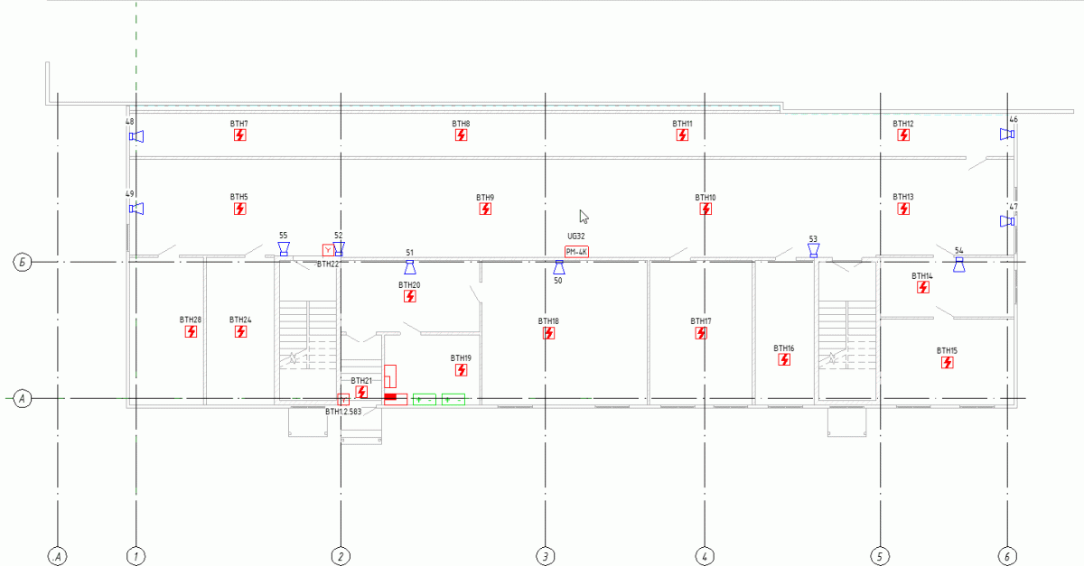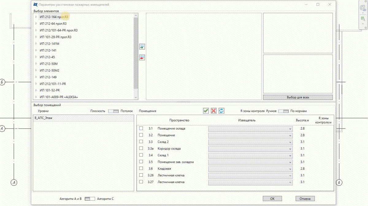 После выбора помещений, в которых необходимо установить пожарные извещатели, R-BIM производит анализ формы и габаритов помещений и расставляет пожарные извещатели по требованиям СП484.1311500.2020 (возможно применение и для СП5.13130.2009), соблюдая нормативные отступы от светильников и вентиляционных решеток.
