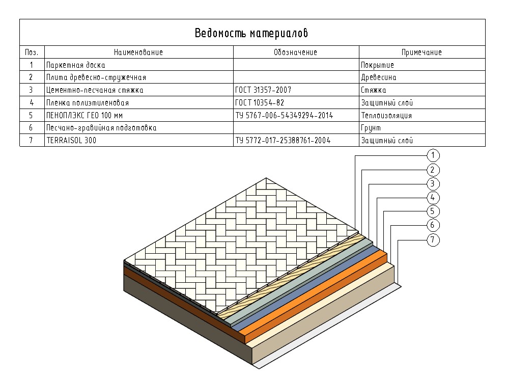 Типоразмер содержит 7 слоев, каждому из которых присвоена соответствующая функция, определяющая его назначение. Так, финишное покрытие-паркет белый, а также плита древесно-стружечная находятся выше границы сердцевины и относятся к отделке.