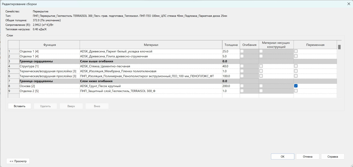 Слои конструктивных решений, которые размещаются на основании моделируются системным семейством категории «перекрытие». Типоразмеры перекрытий включают в себя все остальные слои конструкции.