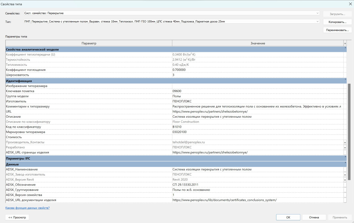 У всех типоразмеров корректно заполнены необходимые параметры. Так, например, для системы изоляции перекрытия с утепленным полом в группах параметров «Идентификация» и «Данные» можно найти комментарий к типоразмеру, описание, ссылку на страницу с документацией и ряд других параметров, которые содержат дополнительную информацию о конструктивном решении.