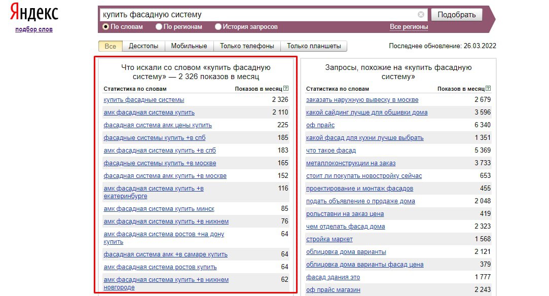 Рассмотрим на примере: допустим, вы производите фасадные системы, и у вас хорошо развита сеть доставок. Согласно Яндекс Wordstat в среднем около 6 000 потенциальных покупателей ежемесячно ищут данную продукцию.