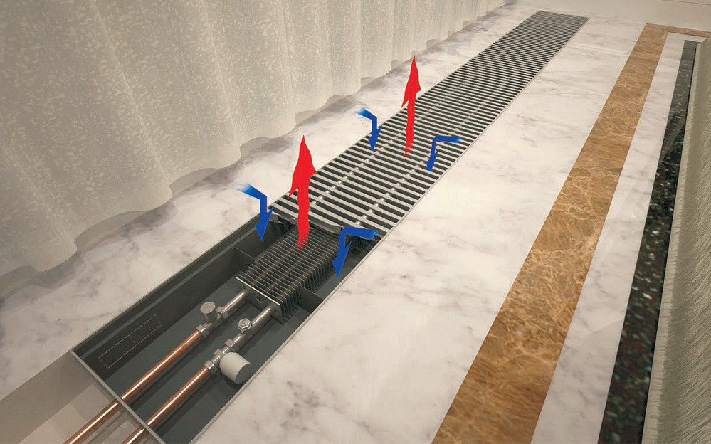 Внутрипольный конвектор представляет собой корпус из оцинкованной (либо нержавеющей) стали, внутри которого расположен теплообменник из медной трубы и надетых на неё алюминиевых ламелей. Труба нагревается от теплоносителя (чаще всего горячей воды) и передаёт тепло ламелям. Холодный воздух, попадая внутрь конвектора, проходит через теплообменник, нагревается и уже тёплый быстро и равномерно распределяется в помещении посредством конвекции.Александр Сергеев технический директор ТД Альянс-Трейд (Techno)