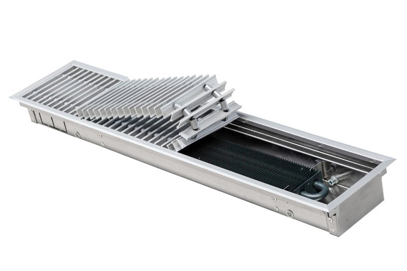 Выполняются, как правило, из медных трубок, а для увеличения площади теплоотдачи трубки, по которой циркулирует теплоноситель, дополнительно применяются алюминиевые пластины. При монтаже ребристая конструкция утапливается в каналы пола, а сверху накрывается решёткой, которая не только защищает систему обогрева, но и выполняет декоративную функцию. В соответствии с применяемыми к решёткам требованиями прочности и надёжности, они выдерживают нагрузки от передвижения людей, а температура их поверхности не может превышать 38-40 градусов, такие значения являются безопасными для человека. Для самостоятельного отопления помещений внутрипольные конвекторы должны иметь внушительные размеры, поэтому чаще они выступают дополнением к тёплому полу и настенным радиаторам, при этом плюсом является их абсолютная бесшумность.