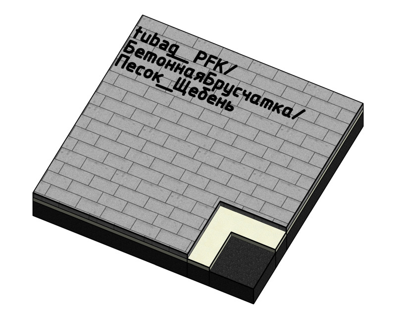 Покрытие бетонной брусчаткой: FUS, бетонная брусчатка, песок, щебень