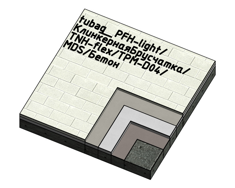 Покрытие клинкерной брусчаткой: PFH-light, клинкерная брусчатка, TNH-flex, TPM-D04, MDS, бетон