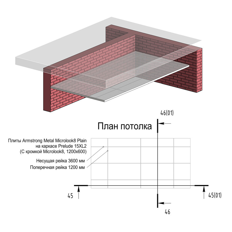 Подвесной потолок на каркасе Prelude 15XL2 с кромкой Microlook. Панели Plain 1200х600 мм