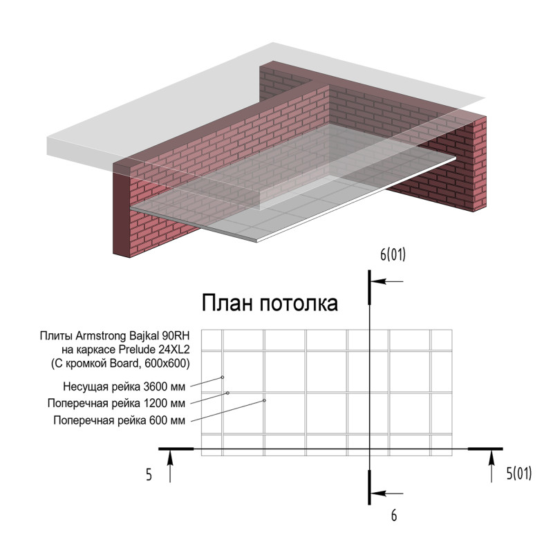 Подвесной потолок на каркасе Prelude 24XL2 с кромкой Board. Панели Bajkal 90 RH 600х600 мм