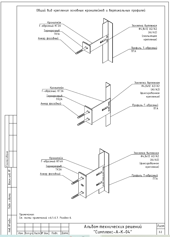 Альбом технических решений. Конструкция алюминиевой навесной фасадной системы с воздушным зазором «Симплекс-А-0з» для облицовки композитными кассетами (DWG)