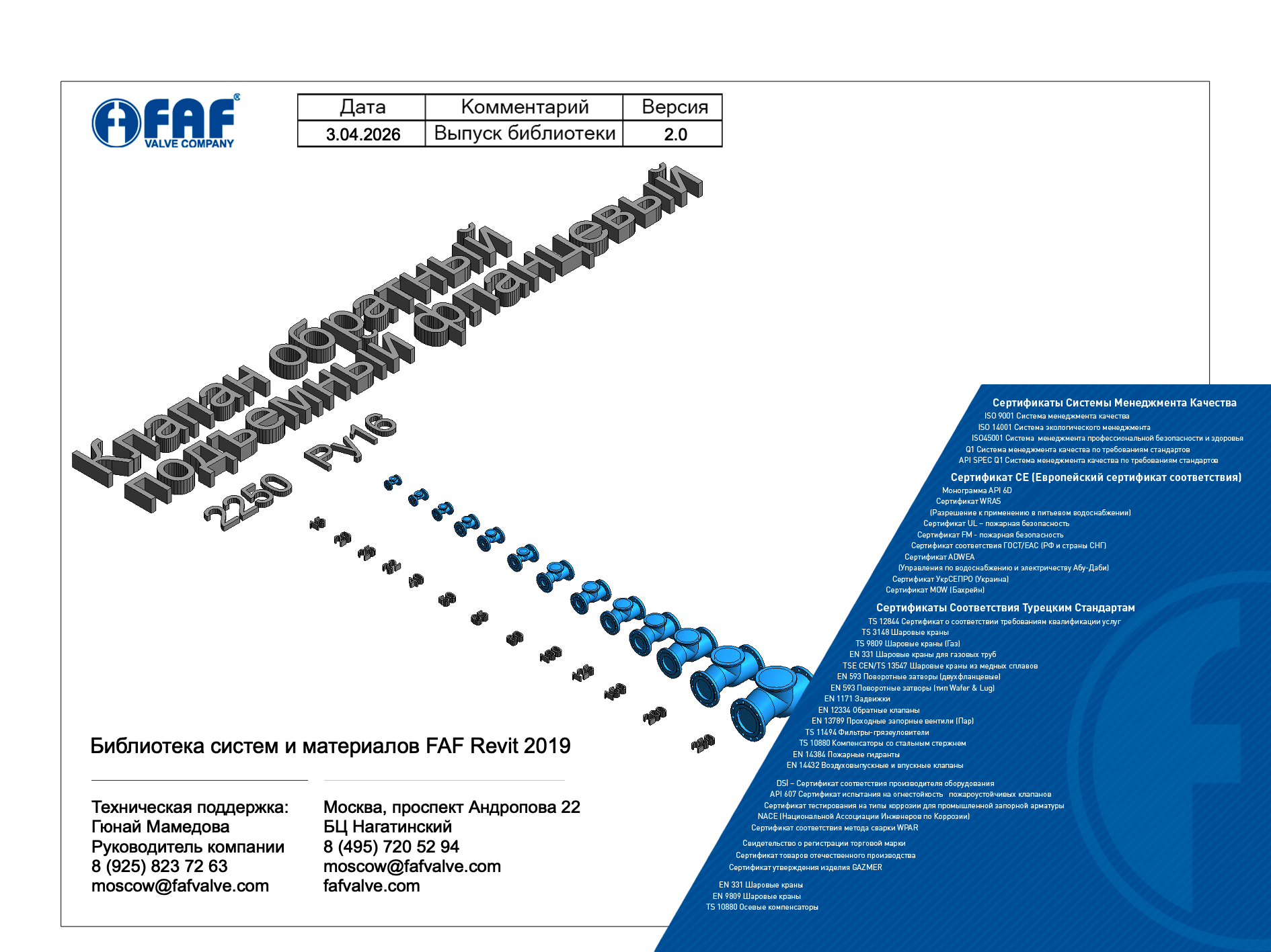 Модель выполнена в Autodesk Revit 2019. ФОП 2019. LOD 300 и УГО. Выгрузка параметров в ведомость оборудования. В семейства добавлен параметр KVs. FAF 2250 — подъемный обратный клапан фланцевого типа с чугунным корпусом и запорным диском из нержавеющей стали. Предназначен для автоматического предотвращения обратного потока среды в трубопроводах ХВС, ГВС, систем отопления, а также на установках с п...