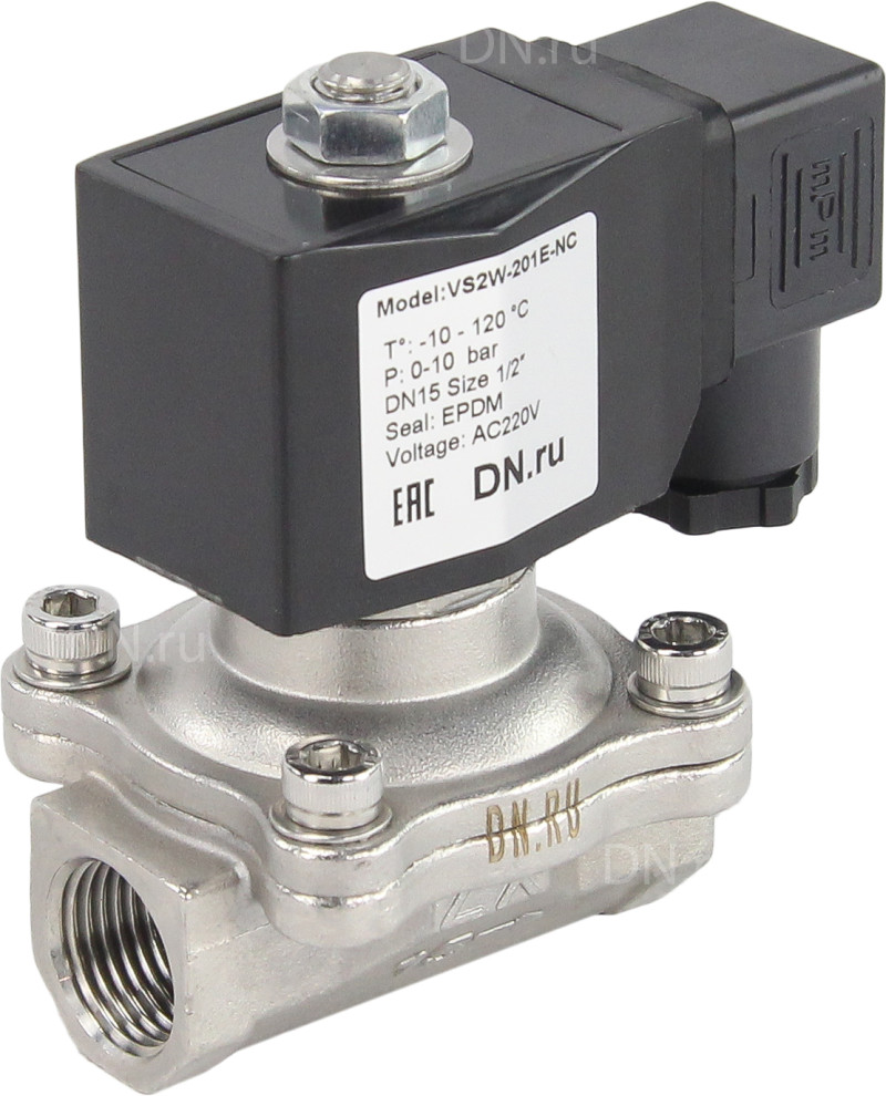 Клапан электромагнитный DN.ru VS231-NT-NC-220VAC 1/2″ Ду15 Ру10, соленоидный двухходовой, корпус - нержавеющая сталь 304, уплотнение - NBR, резьбовой, нормально-закрытый, прямого действия, катушка - 220В (D130-04606)