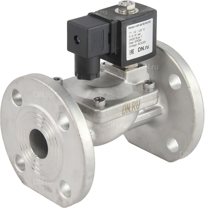 Клапан электромагнитный DN.ru VS631-VF-NC-24VDC Ду25 Ру10, соленоидный двухходовой, корпус - нержавеющая сталь 304, уплотнение - Viton, фланцевый, нормально-закрытый, пилотный, катушка - 24В (D130-04567)
