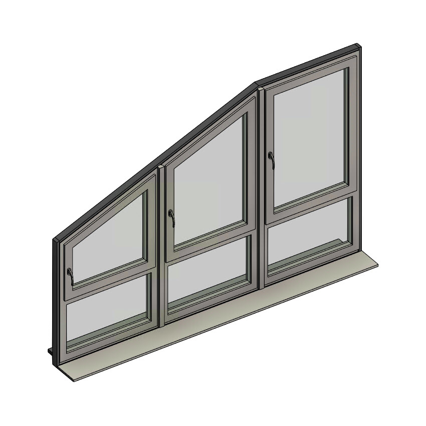 Пятиугольный оконный блок трехстворчатый с двумя косыми слева с фрамугами под каждой створкой. Стандартная комплектация с двухкамерным стеклопакетом 40 мм с низкоэмиссионным стеклом.