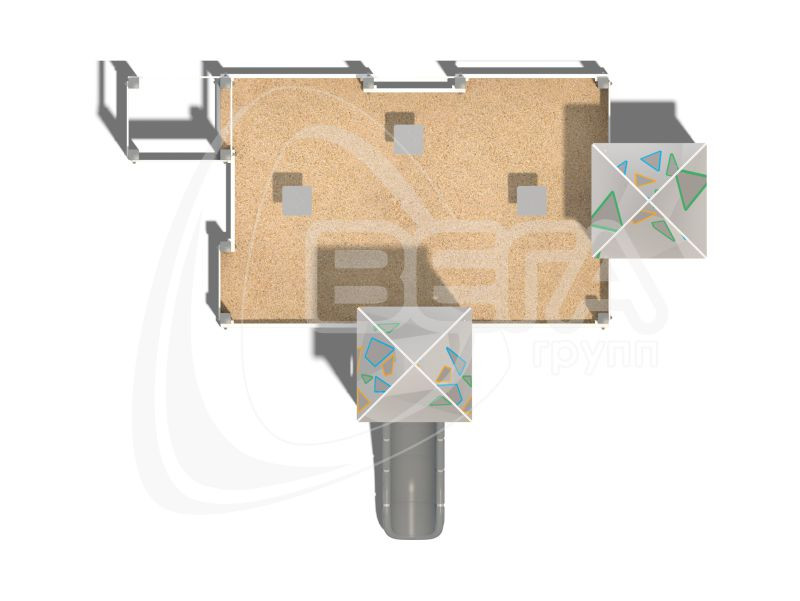 Песочница состоит из деревянного каркаса (столбы) с крышами, площадки и бортиков (доски) на металлических опорных закладных. Оборудована открытым прямым наборным пластиковым спуском, лазом с отверстиями, лавочкой, столиками (3 шт.).