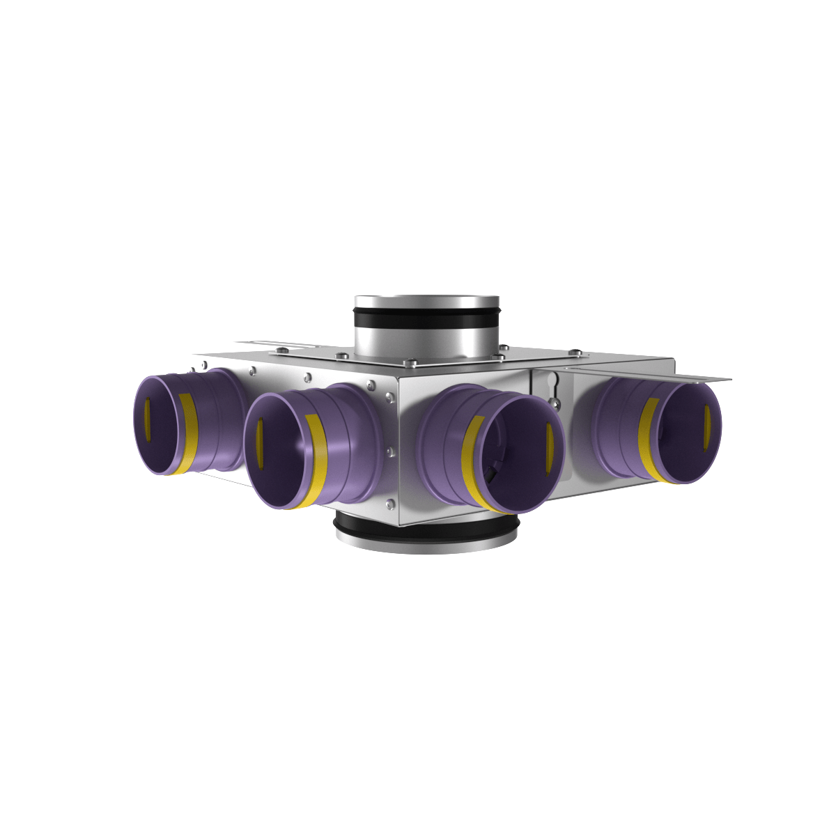 Коллектор воздухораспределительный Provent KVF 160/75×6 предназначен для распределения воздушного потока в системе вентиляции BASIC+ на основе гибких вентканалов Provent диаметром 75 мм. Подающий вентиляционный канал диаметром 160 мм с уплотнительной резинкой разделяется на 6 каналов по 75 мм.