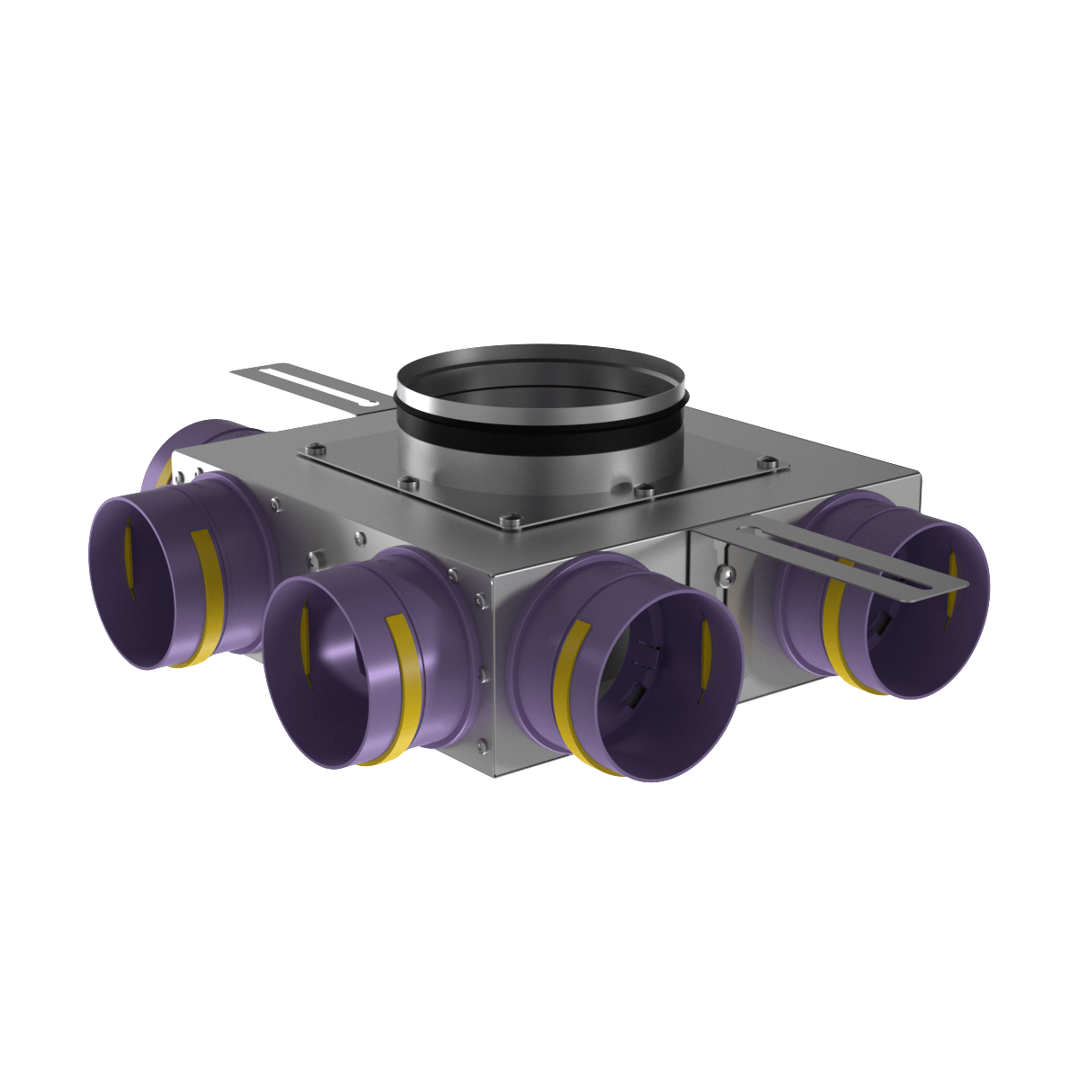 Коллектор воздухораспределительный Provent KVF 160/90×6 предназначен для распределения воздушного потока в системе вентиляции BASIC+ на основе гибких вентканалов Provent диаметром 90 мм. Подающий вентиляционный канал диаметром 160 мм с уплотнительной резинкой разделяется на 6 каналов по 90 мм.