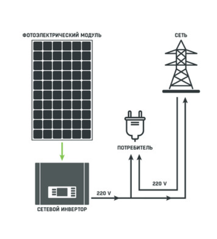 Сетевая солнечная электростанция - это набор оборудования, включающий фотоэлектрические модули, преобразователь, контроллер и другие сопутствующие товары*, необходимые для организации СЭС. Сетевая солнечная электростанция не снабжена аккумуляторными батареями, поэтому предназначена исключительно для питания объектов, подключенных к централизованной сети.