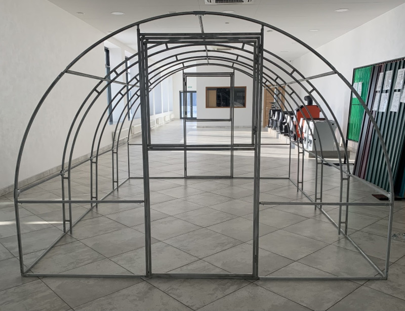 Расстояние между дугами — 1 м Двойные дуги располагаются параллельно и скреплены между собой дополнительными перемычками из оцинкованной трубы Оцинкованная трубы 20х20. Труба оцинкована с внешней и внутренней стороны, цинковое покрытие защищает от коррозии, не требует покраски. Две двери с широкими форточками в противоположных торцах. Сборка "труба в трубу + крабы" 7 продольных соединительных...
