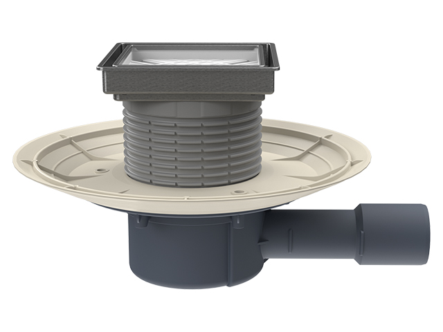 HL510N-3020 Трап для внутренних помещений с гидрозатвором, с горизонтальным выпуском DN40/50, с надставным элементом с подрамником из нержавеющей стали 132х132 мм и вкладышем 112х112 мм для вклеивания керамической плитки, монтажная высота надставного элемента 10-80 мм