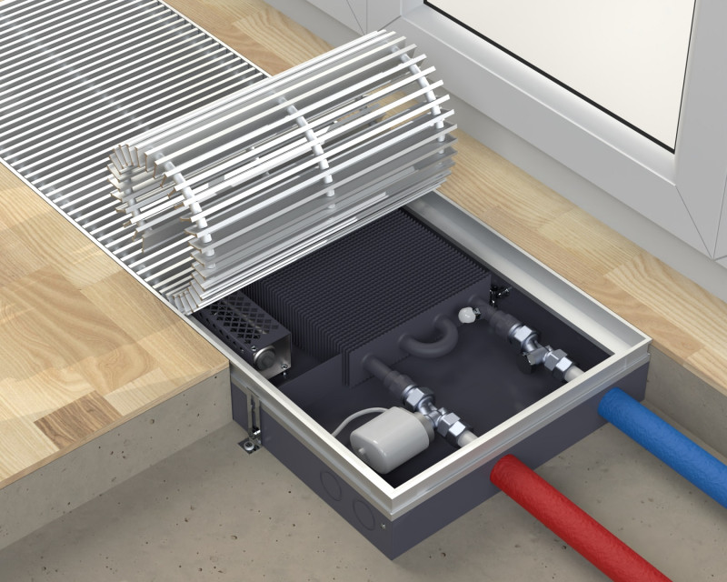 Встраиваемый в пол конвектор с принудительной конвекцией. Благодаря наличию вентилятора КПД прибора увеличивается. Конвекторы данной модели могут работать как с включенными, так и с выключенными вентиляторами.