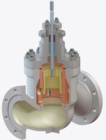 Благодаря сбалансированной по давлению конструкции плунжера клапана для приведения его в действие требуются достаточно незначительные по величине усилия, даже при наличии высокого перепада давления на клапане. Это позволяет использовать для клапанов приводы малой мощности. Внутренние детали клапана объединены в отдельный модуль — запорно- регулирующий узел, фиксируемый в корпусе с помощью крышки и прокладок. Благодаря этому для осуществления ремонтнопрофилактических работ достаточно снять крышку с клапана и заменить запорно-регулирующий узел.